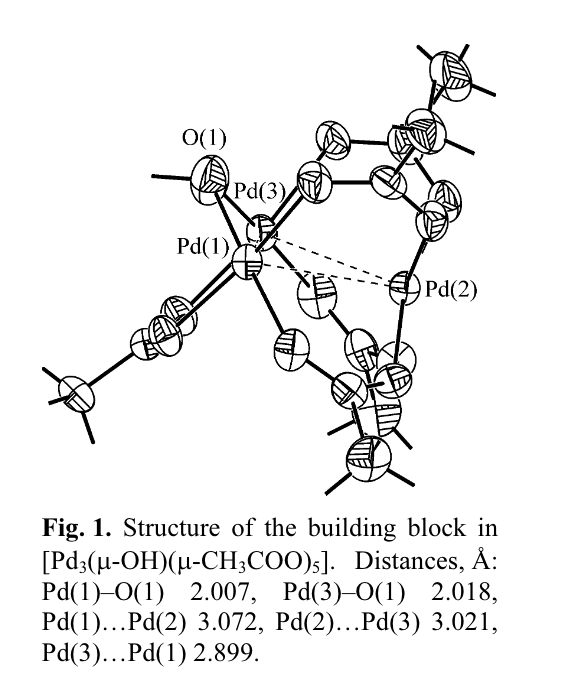 Tatarchuk V.V., Sergievskaya A.P., Kyratieva N.V., Korol’kov I.V., Gromilov S.A. Crystal structure of [Pd3(CH3COO)5(OH)] || J. Struct. Chem. – 2014. – V. 55(1). – P. 142-146. doi.org/10.1134/S0022476614010247